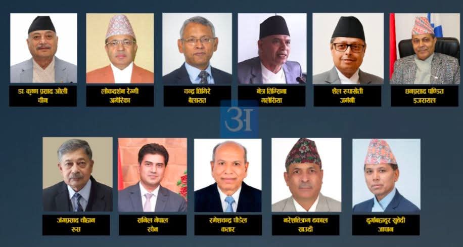 کاٹھمانڈو/کیئر خبر نیپال کی حکومت نے مختلف ممالک میں سیاسی بنیادوں پر تعینات 11 سفیروں کو واپس بلانے کا فیصلہ کیا ہے۔ جمعرات کے روز کابینہ کے اجلاس میں یہ اہم فیصلہ کیا گیا۔ اطلاعات کے مطابق چین میں تعینات سفیر کرشن پرساد اولی، امریکہ میں لوک درشن ریگمی، برطانیہ میں چندر کمار گھمیری، جاپان میں ڈاکٹر درگا بہادر سویدی، جرمنی میں ڈاکٹر شیل روپاکھیٹی، اسرائیل میں ڈاکٹر دھن پرساد...